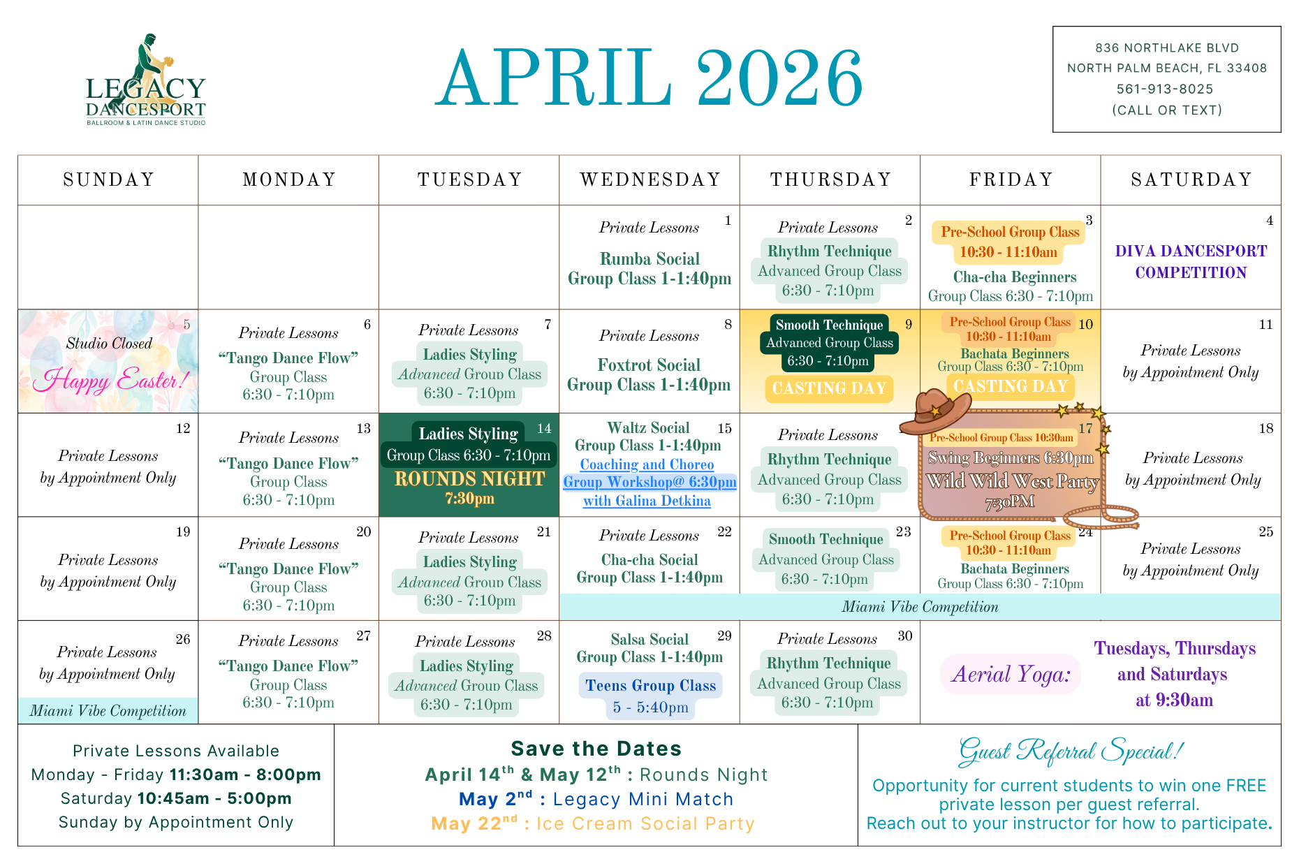 Private lessons available: Monday to Friday 11:30am–8:00pm;